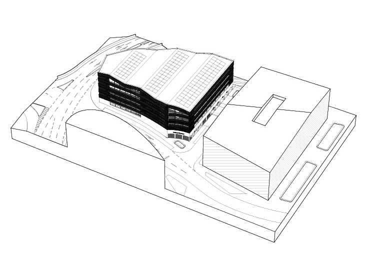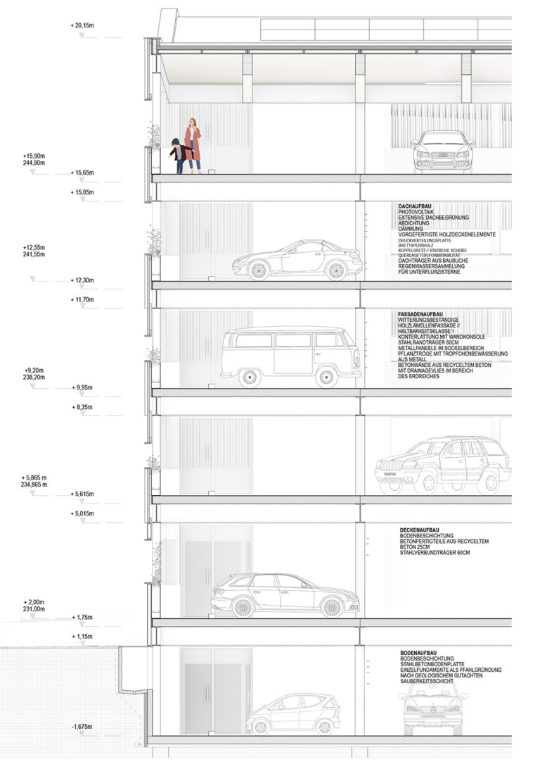 Die Architektur des Parkhauses ist durch eine dynamische Höhenentwicklung und multifunktionale Dachlandschaft gekennzeichnet. Die Dachflächen bieten Möglichkeiten für Photovoltaik-Anlagen und extensive Begrünung, um den Energiebedarf aus erneuerbaren Quellen zu unterstützen und Lebensraum für Insekten und Bienen zu schaffen.