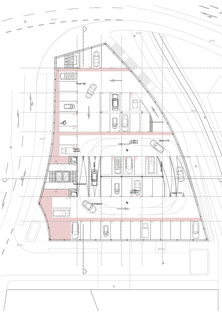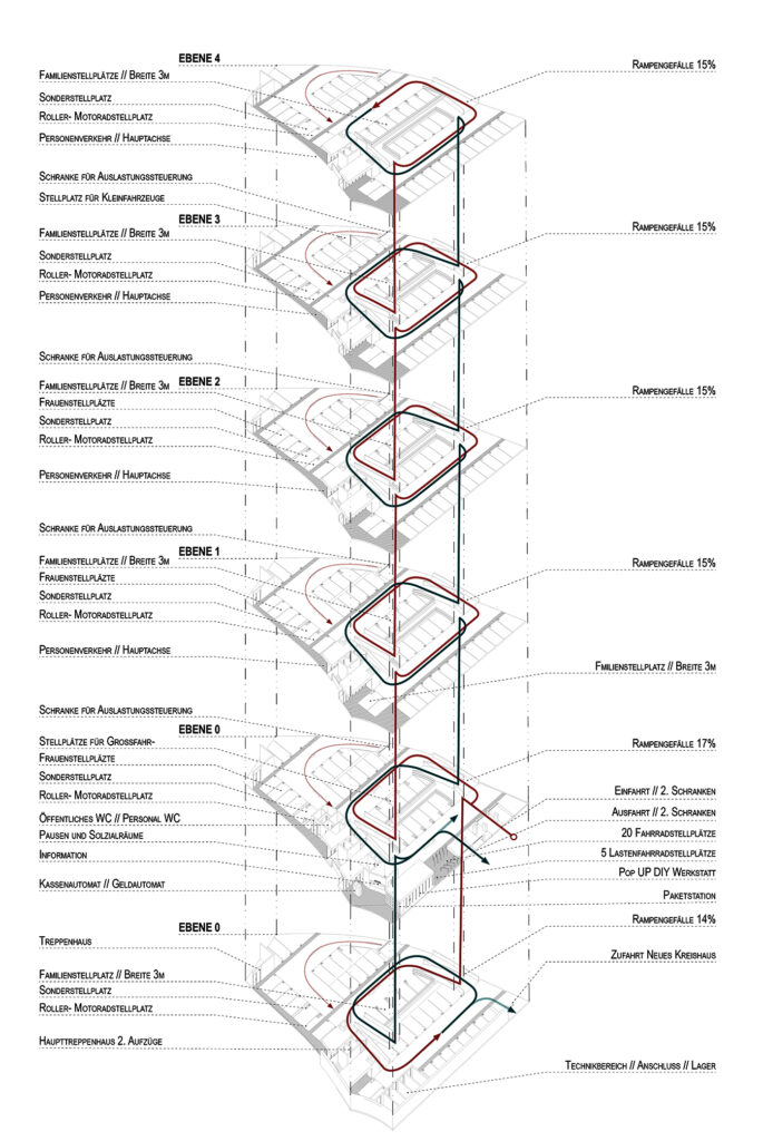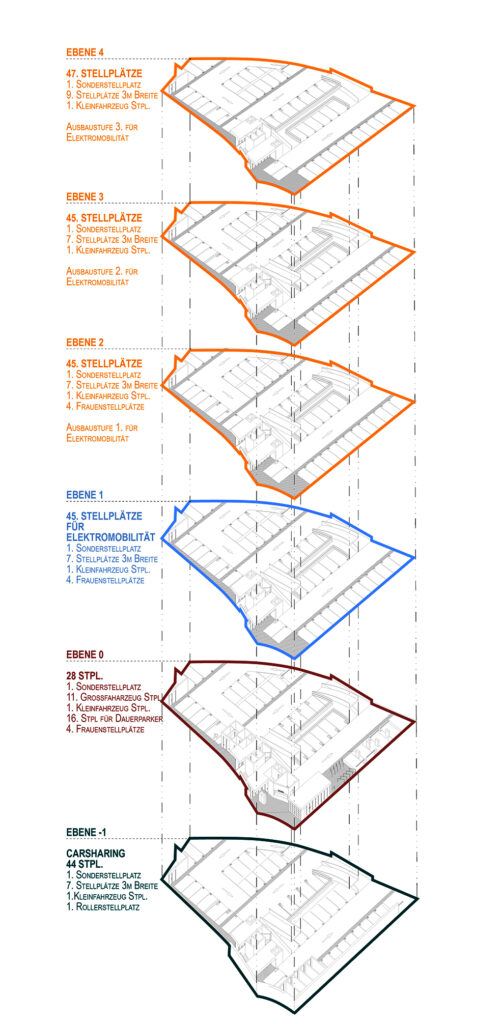Geplant sind 256 Parkplätze auf fünf Ebenen, inklusive Komfort-Parker, Elektrofahrzeuge, Frauen, Motorrad- und Rollerstellplätze. Die Rampenstruktur folgt einem Splitlevelsystem, um das Geländeprofil optimal zu nutzen und kurze Wege zu gewährleisten. Fußgängerinnen und Fußgänger können über farblich hervorgehobene Leitsysteme sicher zu Aufzügen und Treppenhäusern gelangen. Barrierefreie Zugänge unterstützen eine komfortable Nutzung für alle Besuchergruppen.