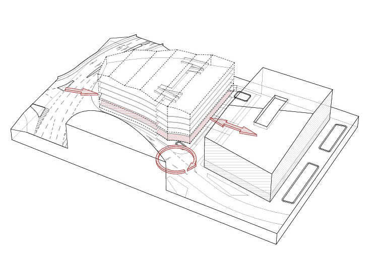 Das Parkhaus nimmt eine prominente Position am Stadteingang ein und kann als Auftakt für ein zusammenhängendes Quartier wirken. Die Vorplatzgestaltung an der südwestlichen Gebäudeseite schafft eine klare Fassung zwischen den benachbarten Nutzungen wie dem Kreishaus Hohenlohe und dem Kaufland. Die Höhenentwicklung vom nördlichen Hochpunkt bis zur südlichen Gebäudespitze sorgt für einen harmonischen Übergang zwischen den benachbarten Strukturen und erzeugt eine klare räumliche Orientierung. Dadurch könnte ein städtebaulich harmonisches Ensemble entstehen, das Orientierung und Aufenthaltsqualität für Besucherinnen und Besucher bietet.