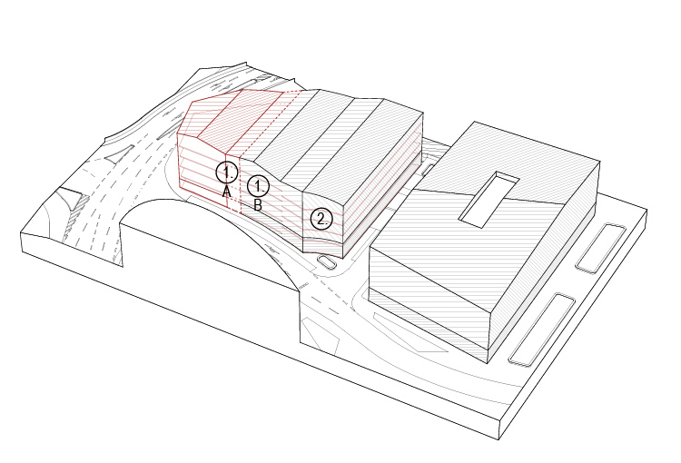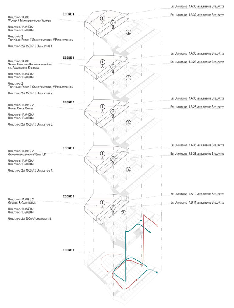 Der nördliche Bereich des Gebäudes, kann ohne funktionale Beinträchtigung des Parkhauses eine seperate Nutzung erhalten. Im Bereich 1A können 400m² pro Etage, einer anderen Nutzung zugeführt werden. Wird der Bereich um 1.B erweitert sind es 600m² pro Etage // Umnutzung