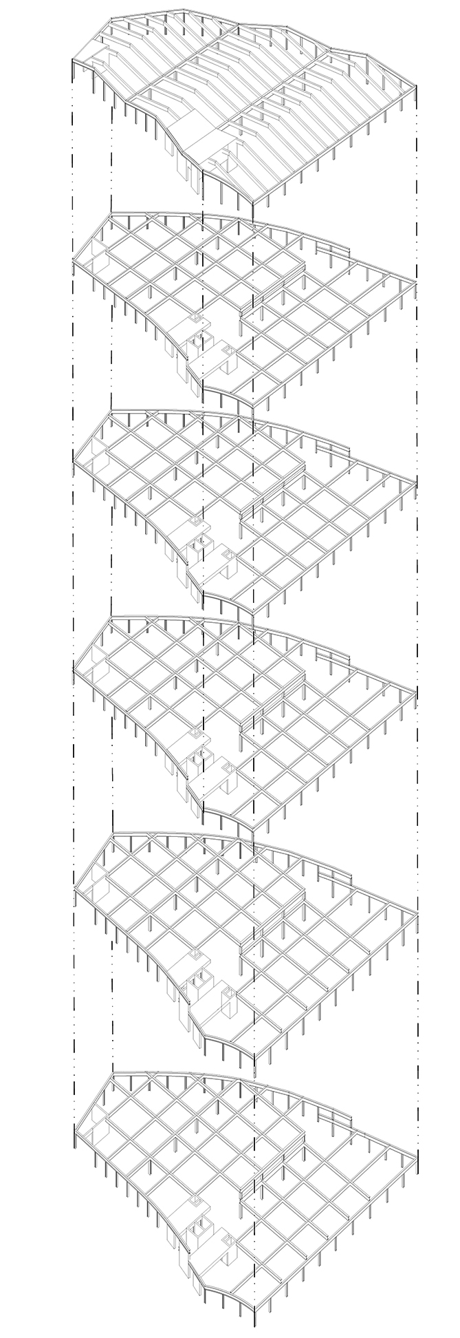 Die Konstruktionsweise ist auf robuste, flexible Nutzung ausgelegt. Vertikale Lasten werden über Stützen und Decken abgetragen, horizontale Lasten über Erschließungskerne. Die Gründung kann an die örtlichen Gegebenheiten angepasst sein, unter Einsatz von Recyclingbeton und CO₂-reduzierten Zementen. Industriell vorgefertigte Bauteile erhöhen Qualität und Nachhaltigkeit. Jede Ebene ist hoch genug, um eine spätere Umgestaltung zu Büro- oder Wohnflächen zu ermöglichen.
