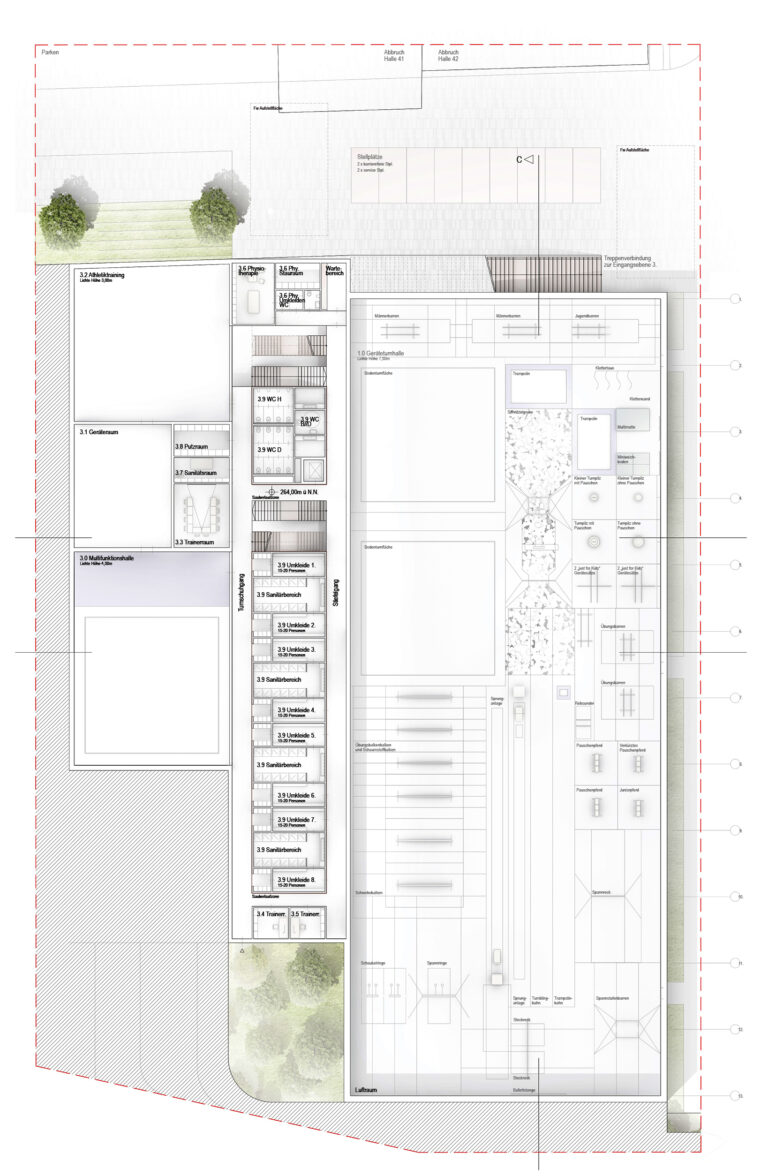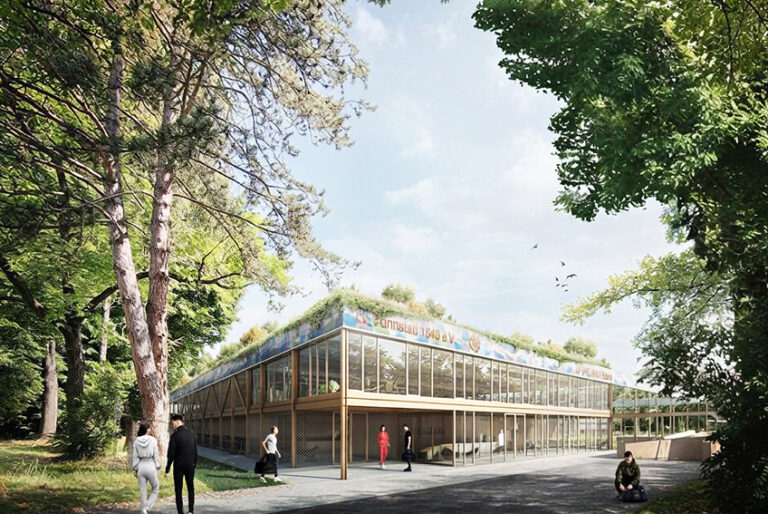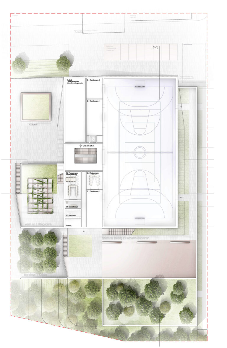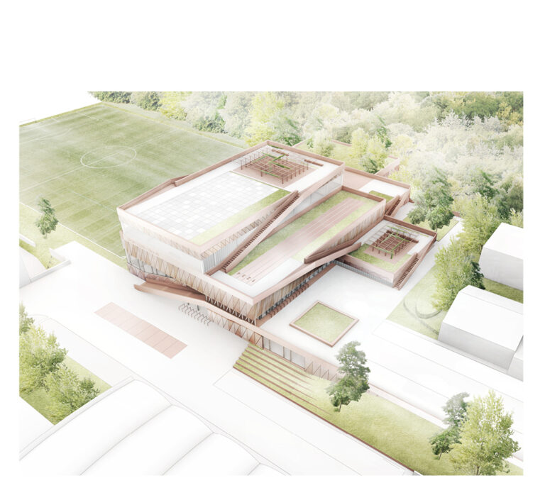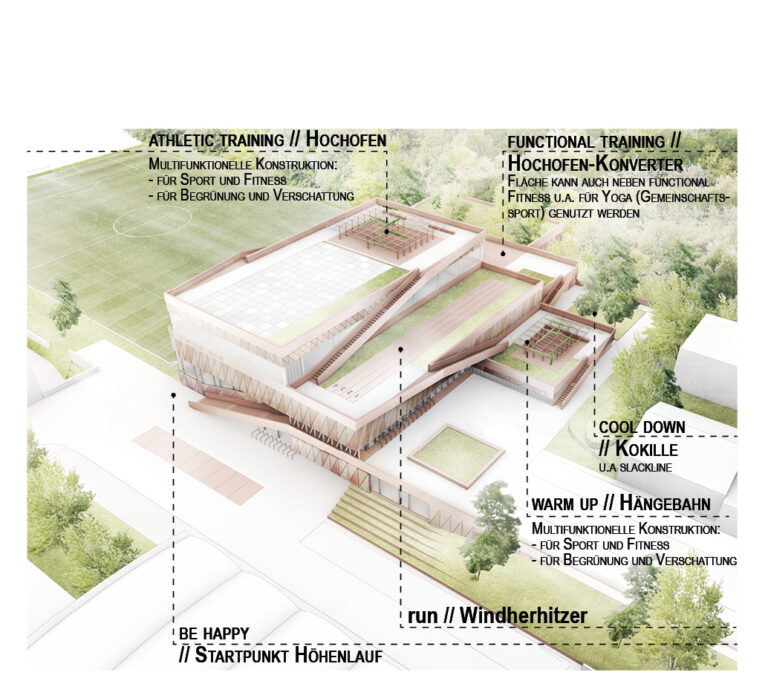 Besonders prägend ist die Verbindung von Architektur und Landschaft: Begrünte Fassaden aus Streckmetall lassen das Gebäude mit seiner Umgebung verschmelzen. Ein schlüssiges Energiekonzept unterstützt diesen nachhaltigen Ansatz. Gleichzeitig setzt der Entwurf auf einfache, wirtschaftliche Materialien und Konstruktionen. Trotz des höheren Aufwands für die komplexen Außen- und Dachflächen würdigt die Jury den Entwurf als selbstbewussten, originellen und identitätsstiftenden Beitrag zur Weiterentwicklung des Sportcampus.