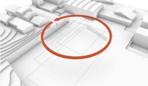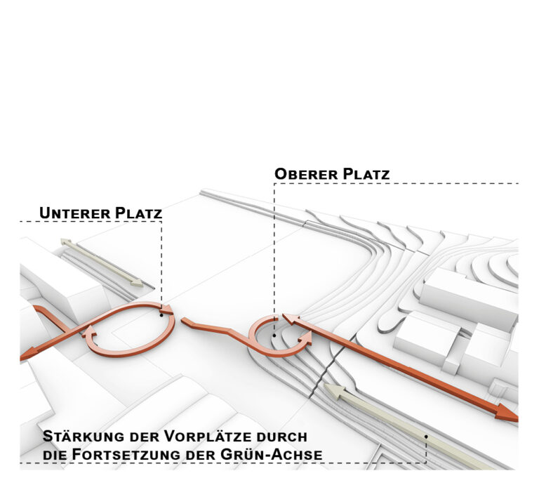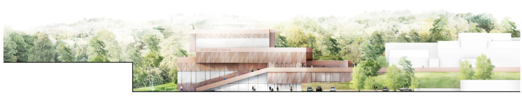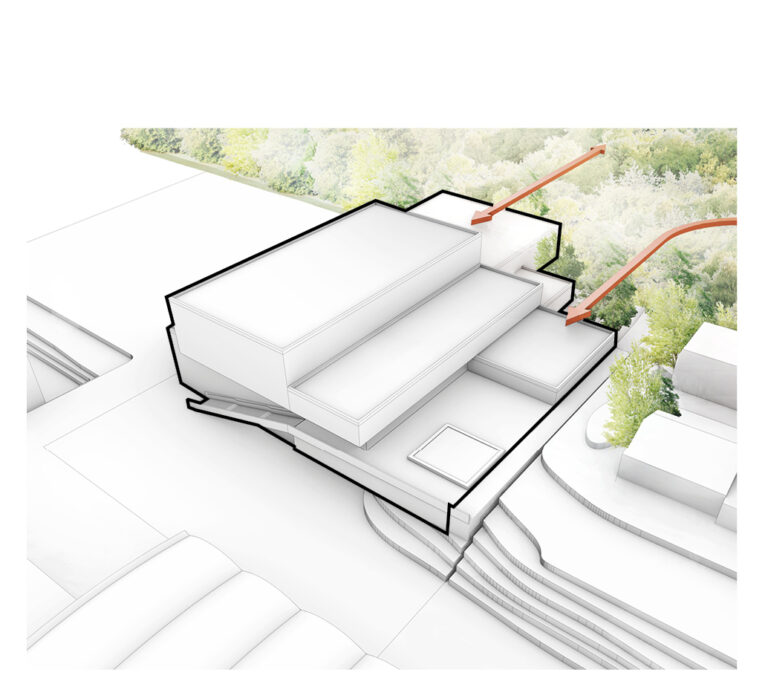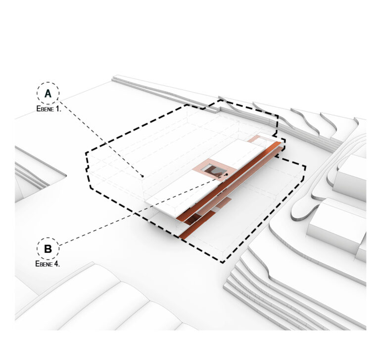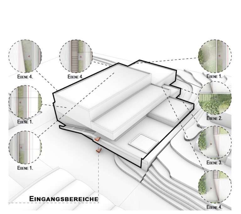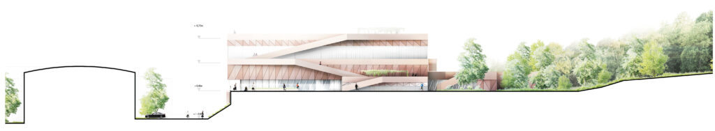 Der mit dem 1. Preis ausgezeichnete Entwurf überzeugt durch eine starke architektonische Idee: Das Gebäude ist als „Landschaft in Architektur“ konzipiert und fügt sich selbstverständlich in die bestehende Bebauung sowie in den angrenzenden Naturraum ein. Durch die gestaffelte Anordnung der Baukörper entstehen plateauförmige Ebenen, die über großzügige Treppen und Rampen miteinander verbunden sind und die unterschiedlichen Geländeniveaus elegant verknüpfen.