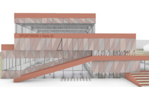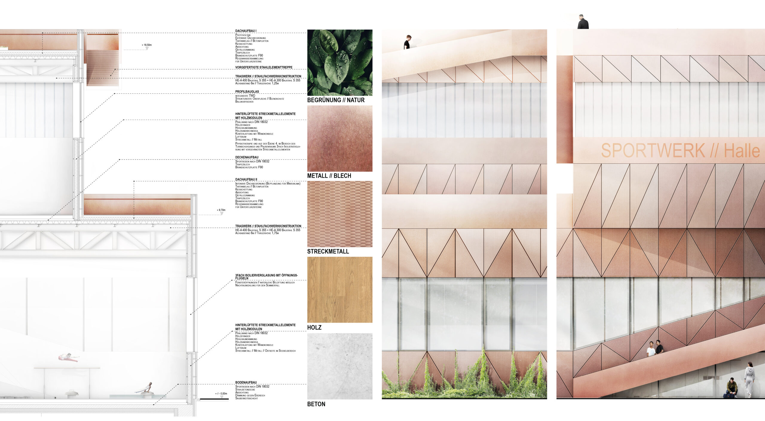 Der Entwurf setzt auf eine klar strukturierte, wirtschaftliche Bauweise mit hohem Vorfertigungsgrad. Innenwände in Holzrahmenbauweise sowie vorgehängte Fassadenelemente aus Streckmetall werden modular gefertigt und ermöglichen eine schnelle, effiziente Realisierung. Die robuste, wartungsarme Fassade ist langlebig und optimal auf den intensiven sportlichen Betrieb am SPORTCAMPUS SAAR in Saarbrücken abgestimmt.