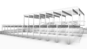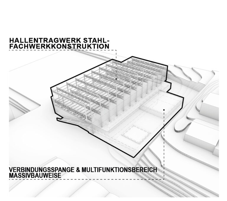 Die Sporthallen werden über materialoptimierte Stahlfachwerke überspannt, die große Spannweiten ermöglichen und zugleich hohe Steifigkeit bieten. Gerade die gestapelte Anordnung stellt hohe Anforderungen an Schwingungs- und Komfortwerte. Das gewählte Tragwerk erfüllt diese Anforderungen effizient und zuverlässig. Standardisierte Stahlquerschnitte sorgen zusätzlich für eine wirtschaftliche Umsetzung. Erschließungs- und Nebenbereiche werden in Massivbauweise mit vorgefertigten Bauteilen realisiert und ergänzen das Gesamtsystem zu einer robusten, langlebigen Struktur.