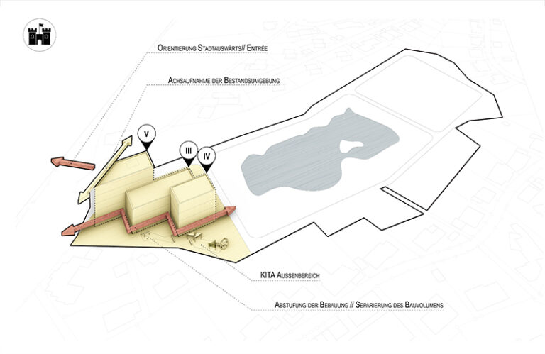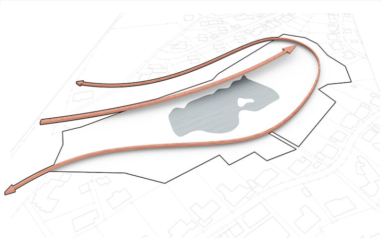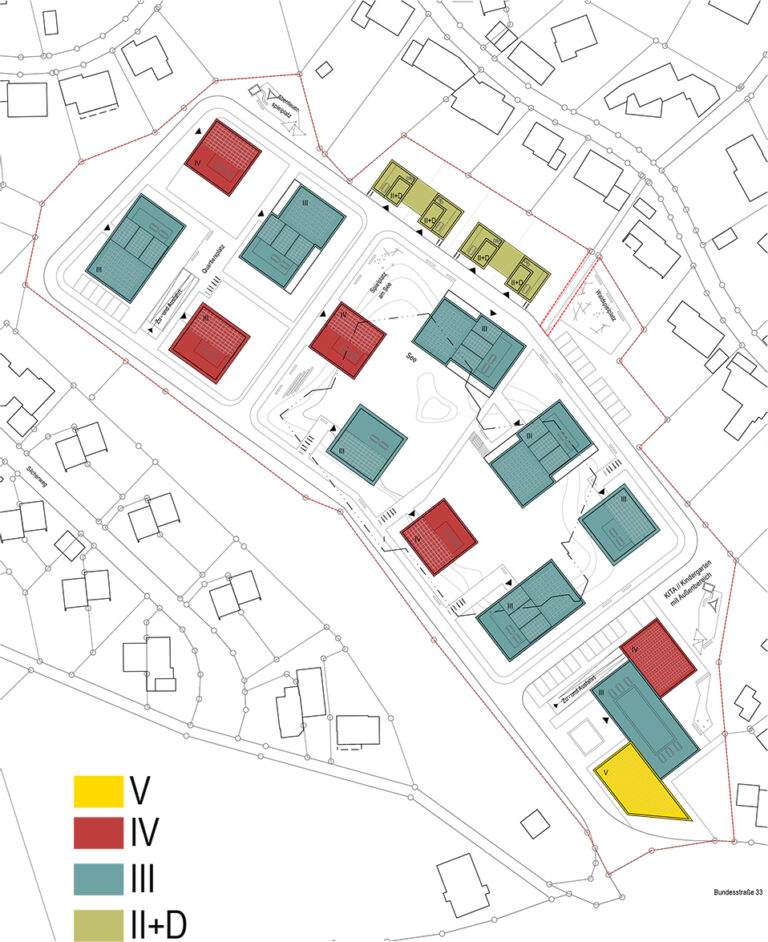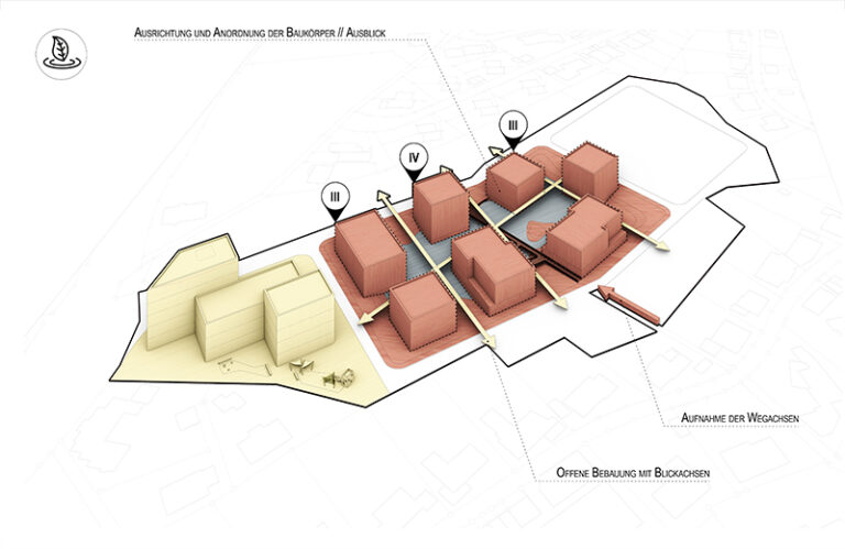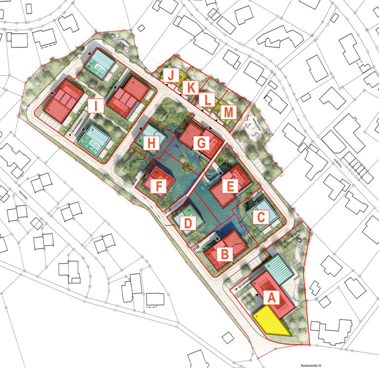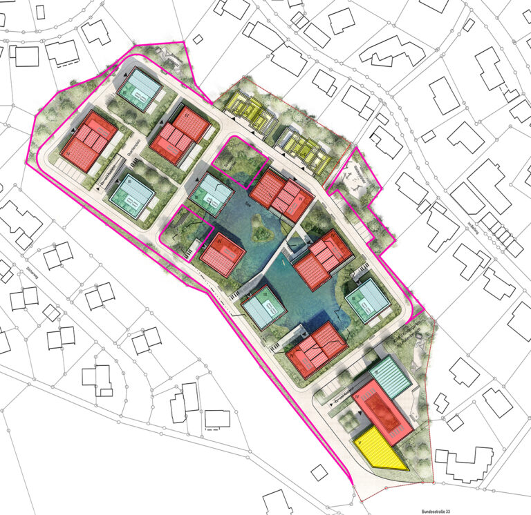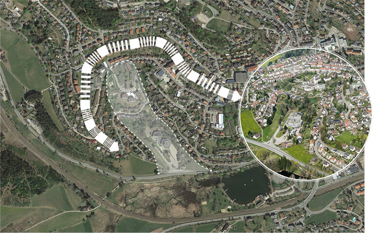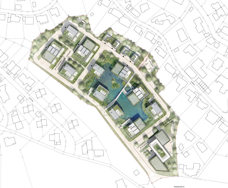 Die Lage an der Bundesstraße B33 verleiht dem Areal eine besondere städtebauliche Bedeutung: Als neues Entrée zur Stadt St. Georgen formuliert das Quartier eine klare Adresse und schafft zugleich eine Verbindung zwischen bestehender Bebauung, Landschaftsraum und urbanen Nutzungen. Die Struktur des Quartiers reagiert sensibel auf die Topografie, auf bestehende Blickbeziehungen sowie auf die umgebenden Stadträume und entwickelt daraus eine klar gegliederte, gut lesbare Ordnung.