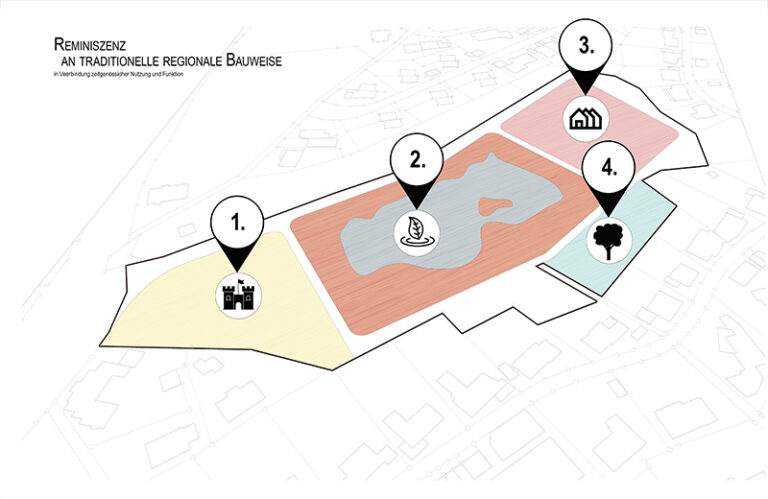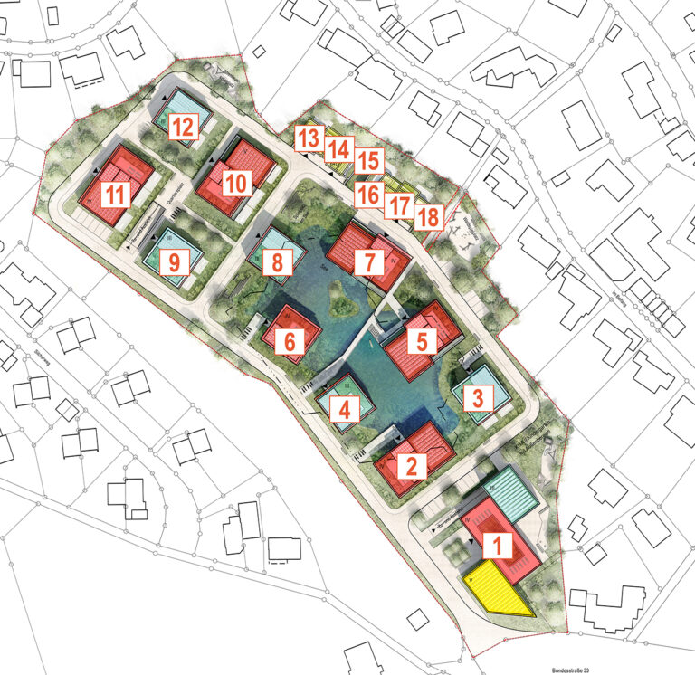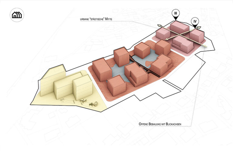 Die Bebauung ist in mehrere Zonen mit unterschiedlichen räumlichen Qualitäten gegliedert: ein markantes Entrée entlang der B33, offene Wohnbereiche mit Blickachsen in Richtung Wasser, eine urbane Mitte mit stärker städtischem Charakter sowie ruhigere, grün geprägte Wohnzonen. Diese Staffelung der Baukörper in Höhe und Volumen sorgt für eine harmonische Einbindung in den Stadtraum von St. Georgen und schafft gleichzeitig klare Adressen innerhalb des Quartiers.