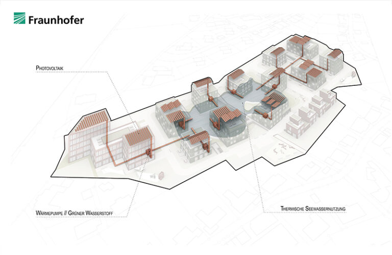 Das Quartier setzt auf ein ganzheitliches Nachhaltigkeitskonzept, das Energie, Konstruktion und Stadtraum miteinander verbindet. Die energetische Grundidee basiert auf einer Kombination aus thermischer Seewassernutzung, Photovoltaik, Wärmepumpen und der Perspektive grüner Wasserstofftechnologien. Diese Bausteine bilden die Grundlage für eine ressourcenschonende und zukunftsfähige Energieversorgung und unterstreichen den Anspruch, ökologische Verantwortung mit hoher städtebaulicher und architektonischer Qualität zu verbinden.