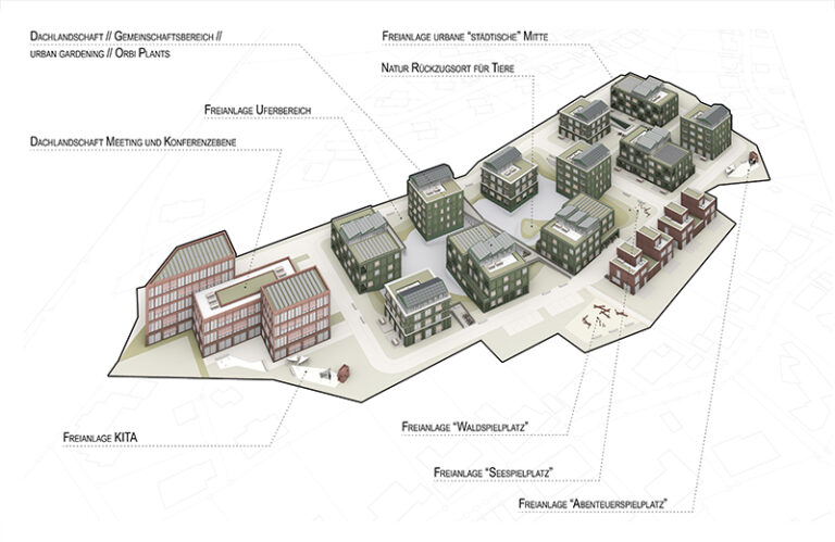 Ein zentrales Element bildet der öffentliche Freiraum. Der Quartiersplatz fungiert als Mittelpunkt und Treffpunkt, ergänzt durch weitere Grün- und Spielflächen wie Waldspielplatz, Abenteuerspielplatz und Seespielplatz. Insgesamt entstehen großzügige öffentliche Verkehrsflächen und Grünräume, die das Quartier nicht nur für Bewohner, sondern auch für die Stadtgesellschaft öffnen. Zusätzlich erweitern nutzbare Dachlandschaften das Freiraumangebot um gemeinschaftlich nutzbare Bereiche für Urban Gardening, Begegnung und Aufenthalt.