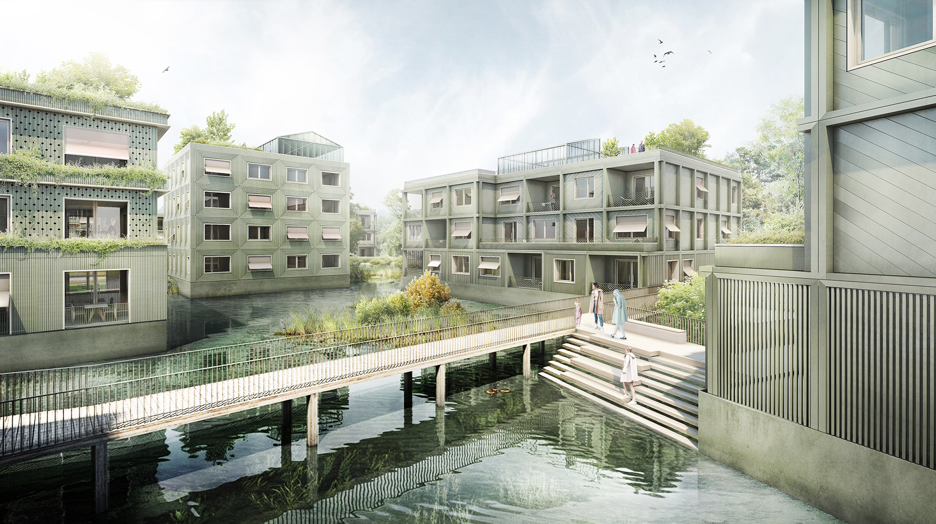 Ergänzt wird dieses Energiekonzept durch eine konsequent mitgedachte Holzbauweise als zentralen Bestandteil der konstruktiven Strategie. Der Einsatz von Holz als nachwachsendem, CO₂-speicherndem Baustoff trägt wesentlich zur Reduzierung der grauen Energie und zur Verbesserung der ökologischen Gesamtbilanz des Quartiers bei. Gleichzeitig ermöglicht die Holzbauweise eine hohe Vorfertigung, präzise Bauprozesse und flexible Grundrissstrukturen, die auf unterschiedliche Nutzungen und zukünftige Anforderungen reagieren können.